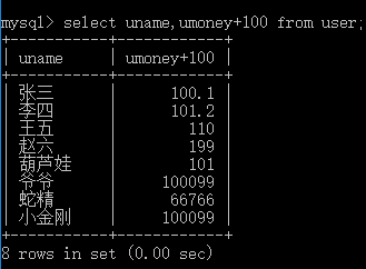 我们在sql语句的操作中,可以直接对列进行运算。将所有存款金额+100元进行显示。