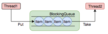 下图中展示了线程1往阻塞队列中添加元素,而线程2从阻塞队列中移除元素: