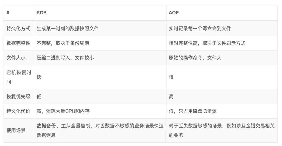 点击蓝色“架构文摘”关注我哟 加个“星标”,每天上午 09:25,干货推送! 来源:http://kaito-kidd.com/ 从这篇文章开始,我们来介绍Redis高可用相关的机制。Redis要想实现高可用,主要有以下方面来保证: 数据持久化 主从复制 自动故障恢复 集群化 这篇文章我们先介绍Redis的高可用保障的基础:数据持久化。因为Redis的主从复制和自动故障恢复,都需要依赖Redis持久化相关的东西。同时,Redis的数据持久化也可以用来做数据备份,用来保障数据的安全性。 Redis是一个内存数据库,它的数据都保存在内存中,如果实例宕机,那么数据则全部丢失。如何保证数据的完整性和安全性也是提高服务高可用的重要机制之一。 Redis提供了完善的持久化机制,可以把内存中的数据持久化到磁盘上,方便我们进行备份数据和快速恢复数据。 这篇文章我们就来分析Redis的数据持久化是如何实现的?我们经常听的RDB和AOF有什么区别?以及它们不同的使用场景。 Redis提供的数据持久化方式主要有2种: RDB:产生一个数据快照文件 AOF:实时追加命令的日志文件 它们分别对应了不同的使用场景,下面我们就来依次分析。 RDB全称 我们可以通过执行save或bgsave命令让Redis在本地生成RDB快照文件,这个RDB文件包含了整个实例接近完整的数据内容。 它的优点如下: RDB文件数据是被压缩写入的,因此RDB文件的体积要比整个实例内存要小 当实例宕机恢复时,加载RDB文件的速度很快,能够在很短时间内迅速恢复文件中的数据 它的缺点也很明显: 由于是某一时刻的数据快照,因此它的数据并不全 生成RDB文件的代价是比较大的,它会消耗大量的CPU和内存资源 因此RDB比较适用于以下场景: 主从全量同步数据 数据库备份 对于丢失数据不敏感的业务场景,实例宕机后快速恢复数据 Redis主从全量同步数据就是使用RDB文件进行的,我们会在后面的文章详细讲到。 由此可以看出,RDB非常适合做数据备份,我们可以定时让Redis生成RDB文件,然后备份这个快照文件即可。 Redis也提供了定时触发生成RDB文件的配置项: 如果达到以上任意条件,则Redis会自动生成新的RDB文件,降低RDB数据内容与实例数据的差异。 在Redis上执行save和bgsave命令都可以生成RDB文件,但前者是在前台执行的,也就是说在生成RDB文件时,会阻塞整个实例,在RDB未生成之前,任何请求都是无法处理的,对于内存很大的实例,生成RDB文件非常耗时,显然这是我们不能接受的。 所以通常我们会选择执行bgsave让Redis在后台生成RDB文件,这样Redis依旧可以处理客户端请求,不会阻塞整个实例。 但不是说后台生成RDB就是没有代价的,Redis为了实现后台把内存数据的快照写入文件,采用了操作系统提供的Copy On Write技术,也就是我们熟知的fork系统调用。 虽然子进程与父进程共享同一块内存地址空间,但在fork子进程时,操作系统需要拷贝父进程的内存页表给子进程,如果整个Redis实例内存占用很大,那么它的内存页表也会很大,在拷贝时就会比较耗时,同时这个过程会消耗大量的CPU资源。在完成拷贝之前父进程也处于阻塞状态,无法处理客户端请求。 fork执行完之后,子进程就可以扫描自身所有的内存数据,然后把全部数据写入到RDB文件中。 之后父进程依旧处理客户端的请求,当在处理写命令时,父进程会重新分配新的内存地址空间,从操作系统申请新的内存使用,不再与子进程共享,这个过程就是Copy On Write(写实复制)名字的由来。这样父子进程的内存就会逐渐分离,父进程申请新的内存空间并更改内存数据,子进程的内存数据不受影响。 由此可以看出,在生成RDB文件时,不仅消耗CPU资源,还有需要占用最多一倍的内存空间。 我们在Redis执行info命令,可以看到fork子进程的耗时,可以通过这个耗时来评估fork时间是否符合预期。同时我们应该保证Redis机器拥有足够的CPU和内存资源,并合理设置生成RDB的时机。 AOF全称为 我们可以通过配置文件开启AOF: 开启AOF后,Redis会把每个写操作的命令记录到文件并持久化到磁盘中,为了保证数据文件的安全性,Redis还提供了文件刷盘的时机: appendfsync always:每次写入都刷盘,对性能影响最大,占用磁盘IO比较高,数据安全性最高 appendfsync everysec:1秒刷一次盘,对性能影响相对较小,节点宕机时最多丢失1秒的数据 appendfsync no:按照操作系统的机制刷盘,对性能影响最小,数据安全性低,节点宕机丢失数据取决于操作系统刷盘机制 以上可以看出AOF相对于RDB的优点是,AOF数据文件更新比较及时,比RDB保存更完整的数据,这样在数据恢复时能够恢复尽量完整的数据,降低丢失数据的风险。 如果同时存在RDB文件和AOF文件,Redis会优先使用AOF文件进行数据恢复。 但它的缺点也很易见: 随着时间增长,AOF文件会越来越大 AOF文件刷盘会增加磁盘IO的负担,可能影响Redis的性能(开启每秒刷盘时) 针对第一种情况,Redis提供了AOF瘦身的功能,可以设置在AOF文件很大时,自动触发AOF重写,Redis会扫描整个实例的数据,重新生成一个AOF文件达成瘦身的效果。但这个重写过程也需要消耗大量的CPU资源。 由于AOF可以最大可能降低丢失数据的风险,所以它一般适用于对丢失数据很敏感的业务场景,例如涉及金钱交易的业务。 如果AOF的刷盘时机设置为每次写入都刷盘,那么会大大降低Redis的写入性能,因为每次写命令都需要写入文件并刷到磁盘中才会返回,当写入量很大时,会增加磁盘IO的负担。 性能与数据安全不能兼得,虽