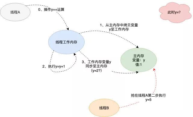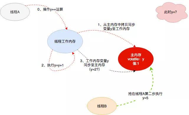 初一看感觉volatile的关键字好像解决了y++这个操作的原子性问题,但实际上我们再看看,如果此时线程A已经执行完第2步了,此时线程B更改了变量y的值,虽然此时线程A知道变量y发生了变化,但是由于操作已经执行完,所以还是只能执行第3步把变量y的值覆盖回主内存,从而又造成了错误数据。