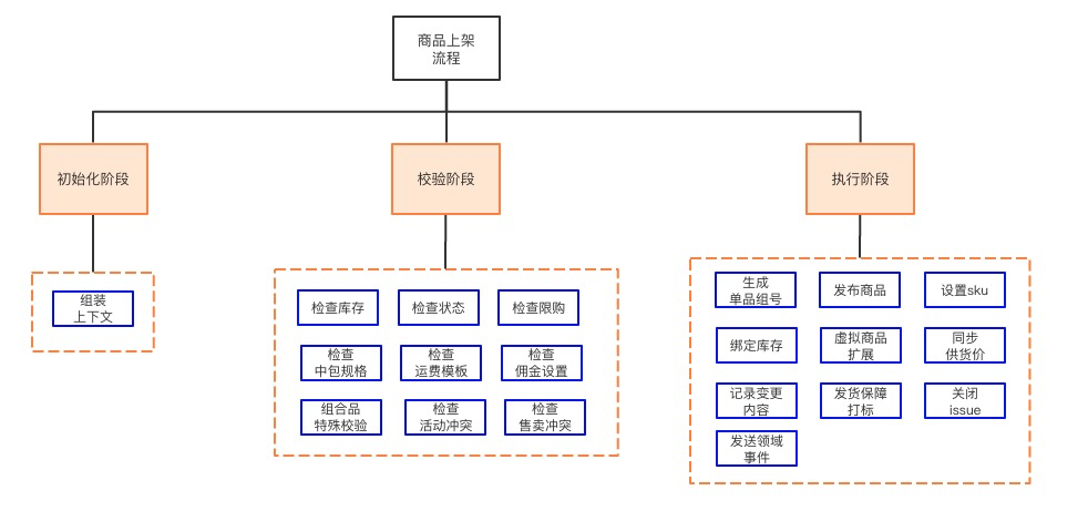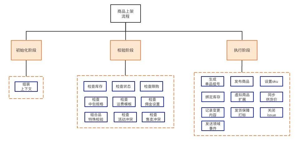 所谓的代码分离是指,对于不同的业务场景,我们用不同的编排代码将他们分开。以商品上架为例,我们可以这样写: