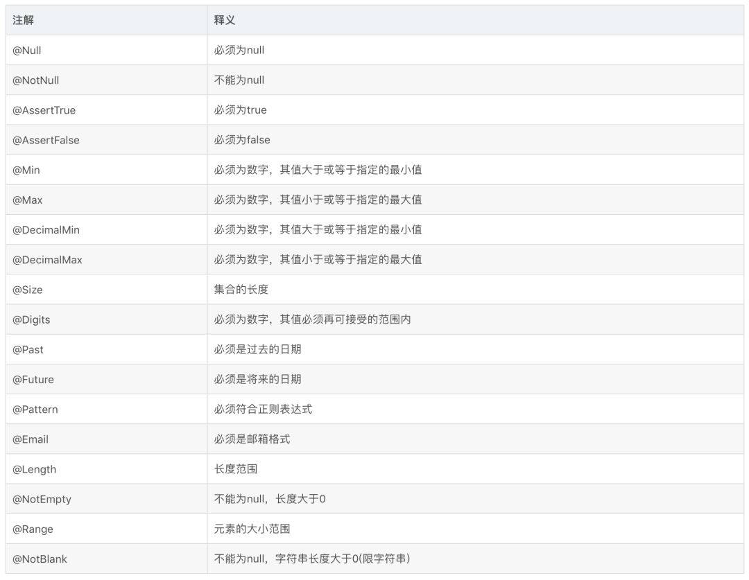 以上这些注解都是“hibernate-validator”依赖包默认提供的,更多常用的注解还有很多,例如: