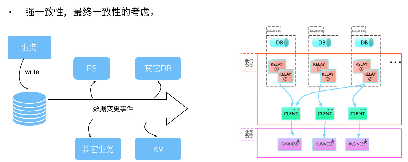 第二是要解决一致性的问题,对于既要写DB也要写缓存的场景,业务写缓存无法保障数据一致性,美团内部主要通过Databus来解决,Databus是一个高可用、低延时、高并发、保证数据一致性的数据库变更实时传输系统。通过Databus上游可以监控业务Binlog变更,通过管道将变更信息传递给ES和其他DB,或者是其他KV系统,利用Databus的高可用特性来保证数据最终是可以同步到其他系统中。