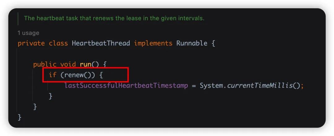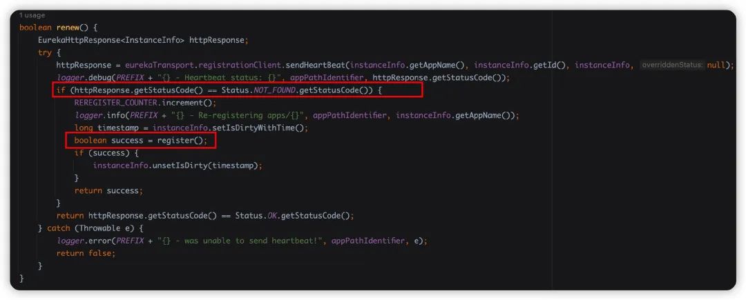 renew方法,这一看我们就知道了,这不就是心跳吗?!NOT_FOUND,就会去注册了啊。