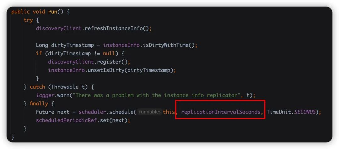 eureka.client.instance-info-replication-interval-seconds=30 //默认30秒DiscoveryClient 的 initScheduledTasks ,这里创建了同步注册到 Eureka Server 的定时任务。