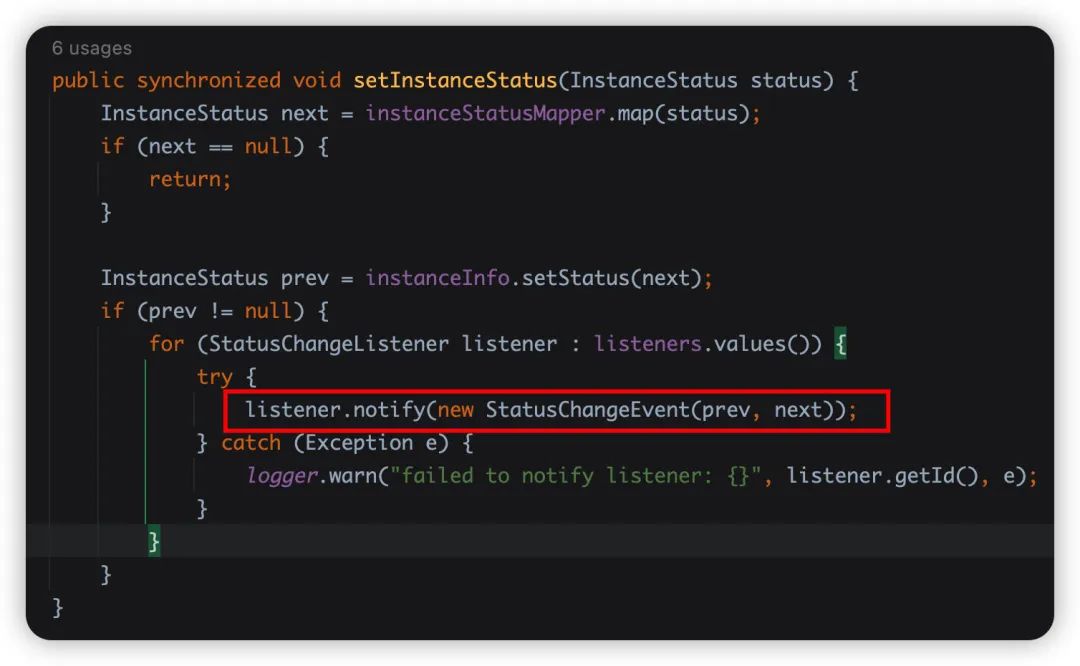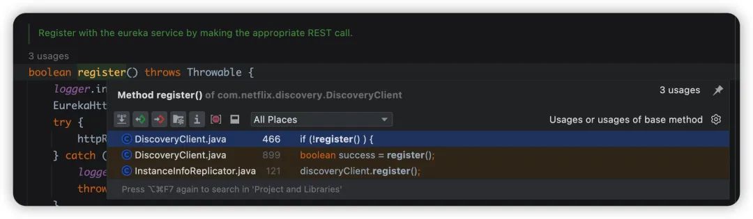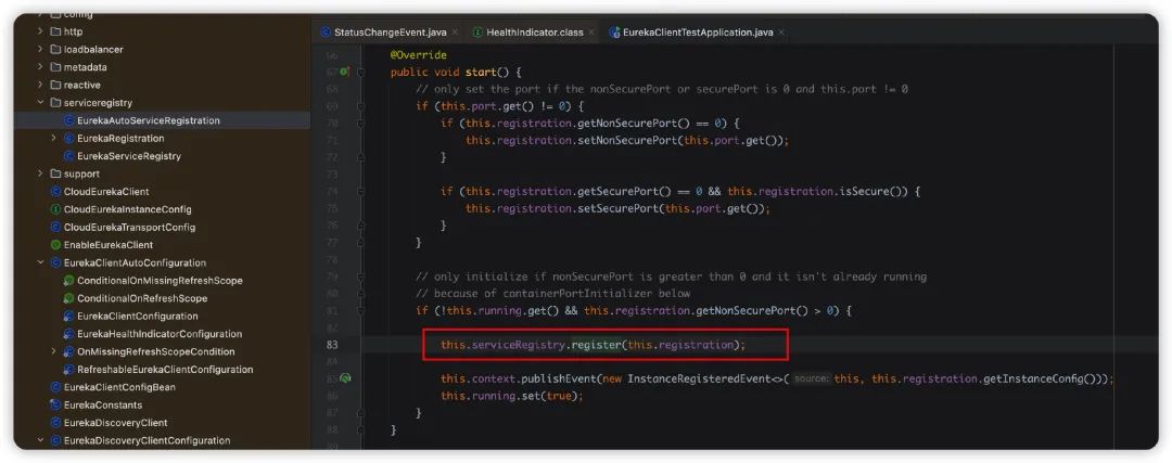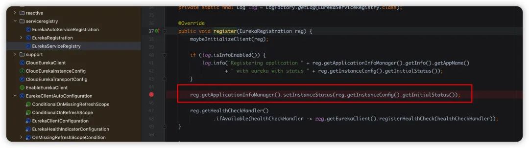 你好,我是悟空,我的好朋友艾小仙同学发现了一个延迟注册的坑,这篇的排查思路还挺有意思的,推荐大家学习一波~ Eureka 有个延迟注册的功能,也就是在服务启动成功之后不立刻注册到 Eureka Server,而是延迟一段时间再去注册,这样做的主要目的是因为虽然服务启动成功了,可能还有一些框架或者业务的代码没有初始化完成,可能会导致调用的报错,所以需要延迟注册。 但是发现,然并卵啊,好像这个延迟注册并没有生效,也是开始了排查之路。 首先,延迟注册的功能主要依赖这两个参数, 我们从源码先来看是怎么做到延迟注册的,先看 之后调用 默认的第一次注册,也就是延迟注册的时间是 40 秒,之后每 30 秒会同步注册信息。 但是,即便我们配置了这俩属性,发现好像没什么卵用,接下来我们要排查下到底是为啥捏? 我发现在 看起来他存在两个调用,第一个是 经过排查我们发现,只要配置了 这里需要特别说明一下 比如我们可以实现 实现 第一个问题我们找到了,发现他不是导致我们问题的根因,于是继续排查。 发现第二个调用,在 这里存在一个配置项 进入 就是通过 这里存在 6 个调用,一一排查,通过源码找啊找,最终定位到服务启动自动装配的地方,在这里去修改服务状态为 继续调用,修改应用为上线 由此我们知道,只要服务启动成功,就会触发事件通知,所以这个基本上是启动成功立刻就会去注册到 Eureka Server,这就会导致延迟注册的失效,从启动日志也能直观的看到这个效果。 为了验证我的猜想,我把这两个配置同时配置成 但是,但是!!! 发现过了几十秒之后,还是注册到 Server 了,真的是醉了。。。 那就继续看吧。 再看下注册方法,可能不止一个地方存在调用,我们发现果然如此,有 3 个地方都调用了注册方法。 第一个调用在 那么继续看第二个调用,第二个调用你看 发送心跳如果返回 感觉已经接近真相了,去找下 Server 心跳的源码,根据调用的路径找到源码位于 可以看到第一次注册的时候从注册表拿到的实例信息是空的,所以直接返回了 false,就会返回 NOT FOUND 了。 看 因此,虽然我们把这两个参数都设置成了 OK,到此,延迟注册不生效的原因找到了,我们做一个总结。 默认情况下,配置了延迟注册的时间并不会生效,因为事件监听默认是 如果需要延迟注册生效,必须 即便我们把所有途径都封死了,但是发送心跳的线程仍然会去注册,所以这个延迟注册的时间最多也不会超过 30 秒,即便配置的延迟时间超过 30 秒。