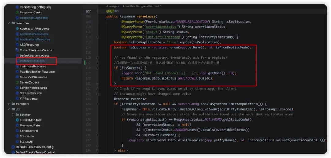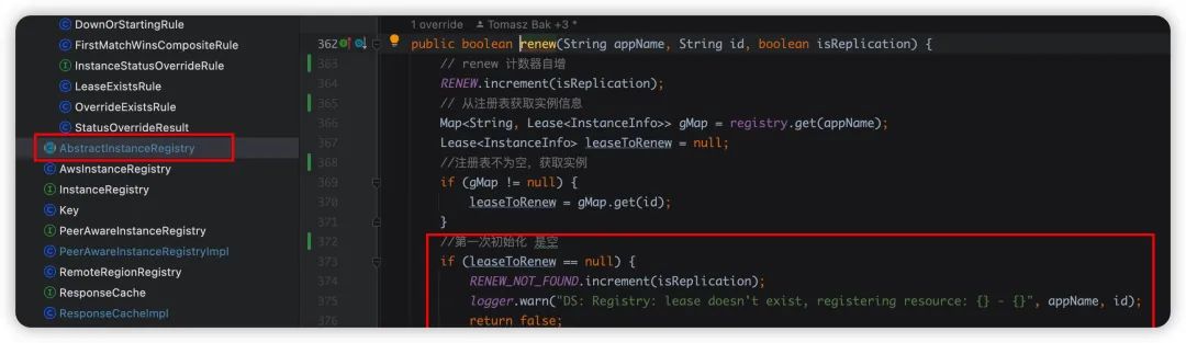 registry.renew方法,最终会调用到AbstractInstanceRegistry中,初始化的时候注册表registry肯定没有当前实例的信息,所以拿到是空的,返回了false,最终就返回了NOT_FOUND。