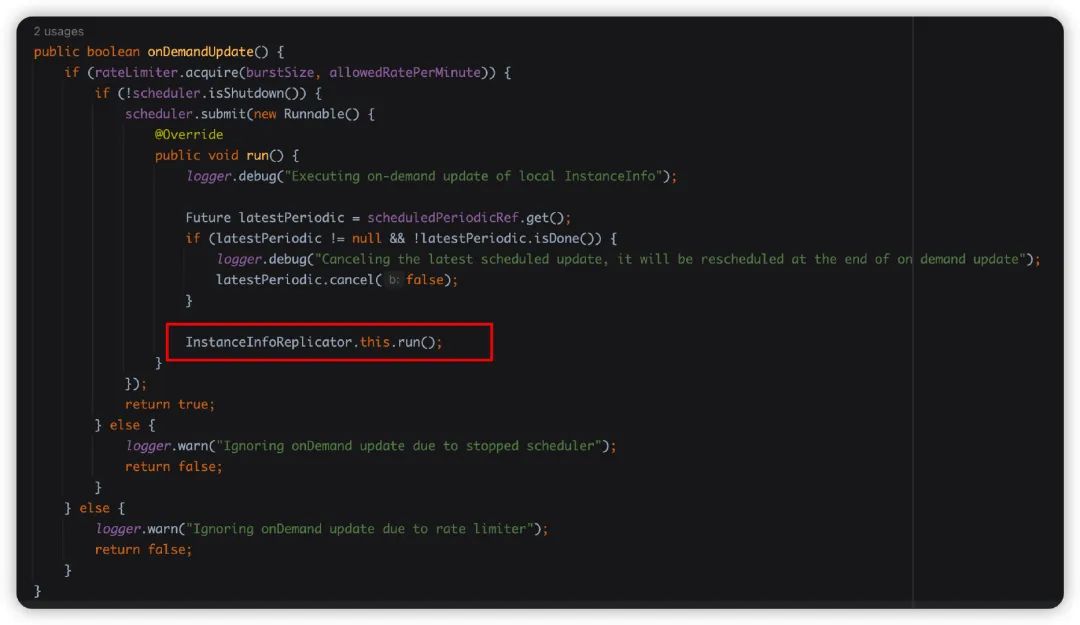 InstanceInfoReplica 中存在这样一段终止当前线程池任务,并且直接调用 run 方法的存在,猜测失效就是他直接调用导致延迟任务没有生效,因为这个方法的直接调用导致延迟注册压根就没效果嘛。