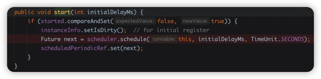 start 方法创建定时任务,并且延迟 40 秒执行,也就是我们达到的延迟注册的效果。