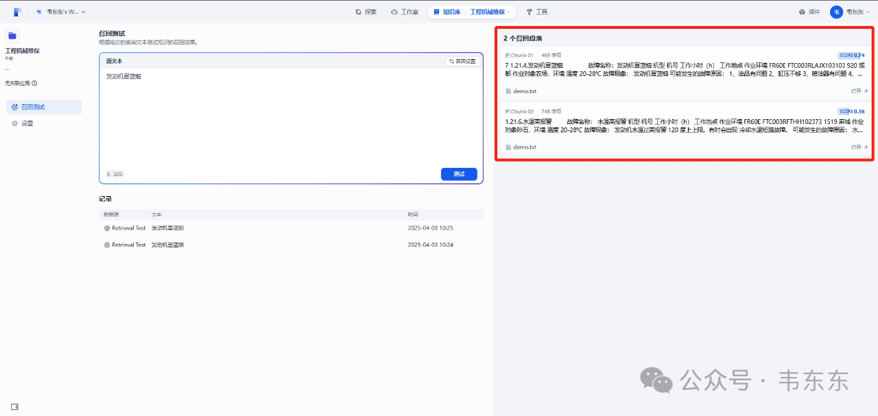 在创建完知识库后,可以大家这个知识库进行召回测试,这个类似 RAGFlow 的检索测试功能,主要是为了检验下上述的两步配置是否成功。需要注意的是,在这一步还不需要配置 LLM 即可进行测试。
