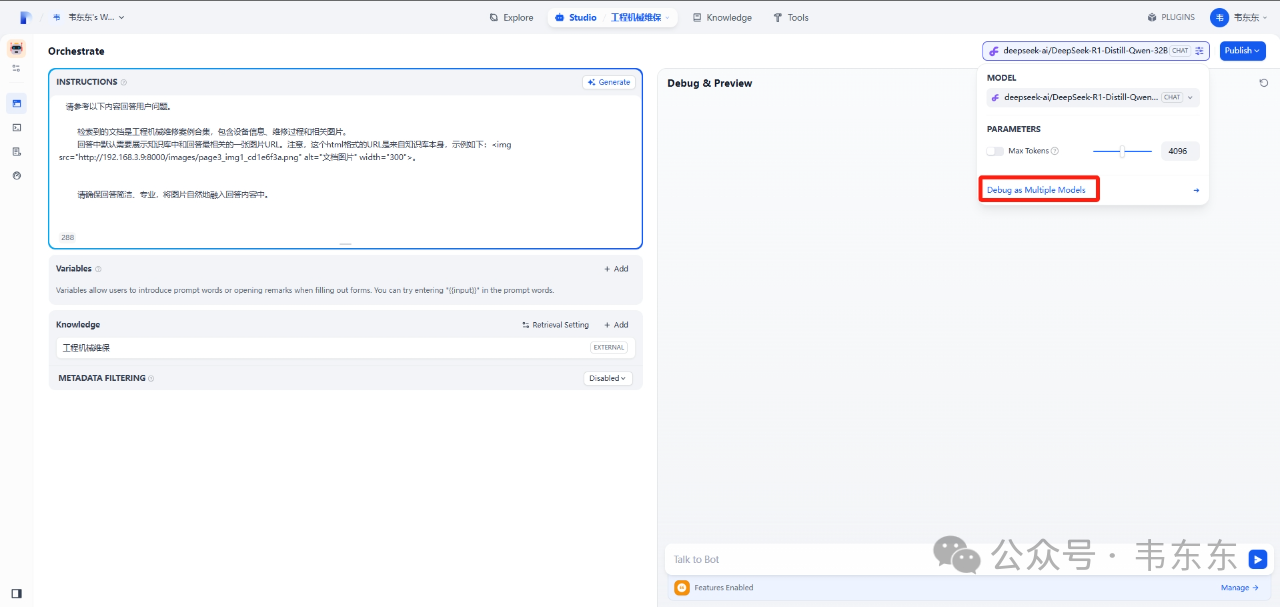 这一步很简单,就是输入系统提示词,绑定上述的第二步创建的知识库,再在右上角选择使用的相关模型即可进行问答测试。我这里为了测试效果,输入的提示词和 RAGFlow 中的保持一致,大家可以做个参考。单就 ChatBot 功能,初步测试下来准确率没有明显差别,图片也能正常显示。