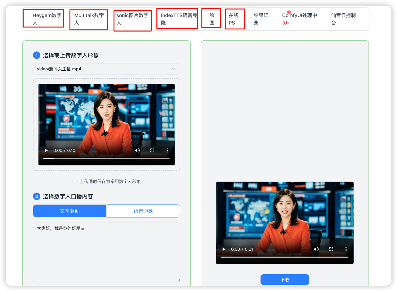 前言 AI数字人今年特别火热,百度数字人、京东数字人等应用纷纷投入获客,用来解决企业营销困境、老板出镜难、拍摄文案剪辑成功高等问题。 但普通人想要使用,费用高昂,市面上服务收费高达3~5元/分钟,开源方案(如heygem/multitalk)部署复杂,使用门槛极高。 以下是一家数字人小程序的价格截图。 一站式AI数字人 为解决以上痛点,作者在国内最好的 GPU 平台:仙宫云,集合顶尖开源大模型,打造一站式AI数字人web镜像,实现一键部署,网页操作,使用体验极简高效。只有有网就能用,还能共享给同事朋友。 Flux生成(可选) 采用顶级开源Flux大模型生成超写实主播形象,支持多风格定制,从商务精英到虚拟偶像全覆盖。 Flux-kontext改图(可选) 革命性"用嘴改图"技术,通过语音指令实时修改数字人形象细节,服装、场景、表情随心调整。 不会英文?不怕,用上页面自带的豆包智能体,输入中文提示词,就能获得优化后的英文提示词,一键粘贴。 Multitalk图片生成视频 使用上生成的单张图片,即可生成数字人视频样本,上传口播音频,底层依靠阿里 Wan 视频大模型,生成自然度媲美真人主播。 建议只生成 5-10s 样本视频即可,生成 5s 视频大概耗时5 分钟(48G4090D)。 拿到主播5s样本视频,扔给后续 Heygem 去快速生成。 Heygem快速生成短视频 Heygem 作为开源顶流数字人,虽然速度快,但是部署起来超级难。 这次我们内置到镜像,同时优化成(语音+文本)双模式驱动。(heygem 本身只有音频驱动) 同时支持管理数字人形象,上传的同时设置为常用,可以避免每次上传,下次使用只要下拉列表,就能选择上传过的数字人形象啦! 怎么使用 1️⃣ 先访问仙宫云平台,通过邀请注册就能白嫖5个小时4090 显卡https://www.xiangongyun.com/register/ICEKVE 2️⃣ 然后选择本镜像一键部署(根据使用选择不同显卡配置)https://www.xiangongyun.com/image/detail/f0ceaf6d-749c-4c14-8eb4-aadcd8ccf9b0?r=ICEKVE 3️⃣ 部署成功后,通过“小白都会用的 web 端”进入 web 页面 刚部署成功后,如果生成失败,请稍等2-4 分钟,请后台服务启动成功。 4️⃣ 尽情使用吧(一定要仔细看使用说明后再用) 技术交流 📧 微信:yyllff2025