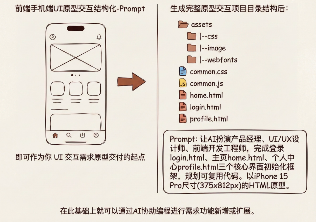 功能作用:让AI 智能编辑器扮演-产品经理、UI 及交互设计师、前端开发工程师多重角色,极大发挥AI协助编程的能力,同时交付出iPhone 15 Pro尺寸(375x812px)的HTML原型页面, 包括登录(login.html)、主页(home.html)、个人中心(profile.html) 三个核心的初始化界面。使用者可以在此基础上依据自己需求需要,根据自己想法实现手机端UI原型交互设计稿。