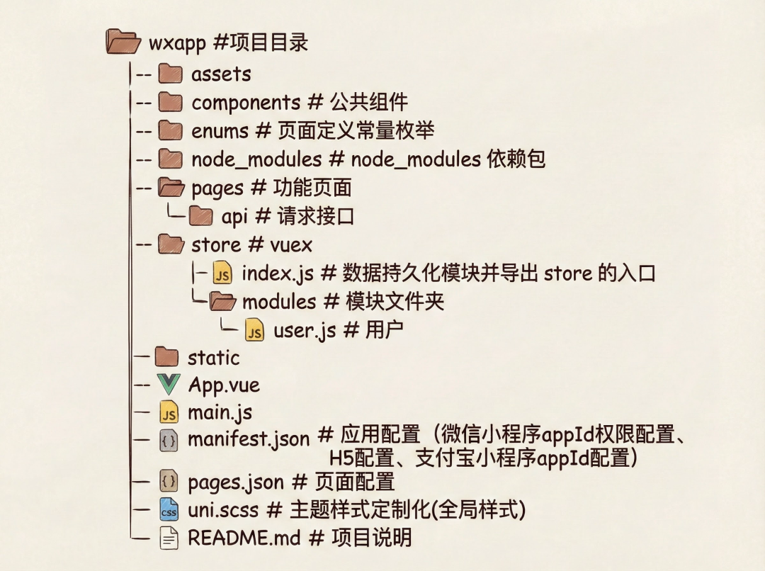 若是从0-1使用uniapp 构建的项目,可控度当然更好,因为每一步开发者了然于心。以下是 使用 vue-cli方式 初始化跨平台 app 小程序目录结构如下: