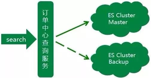 到此,订单中心的ES集群已经初具规模,但由于订单中心业务时效性要求高,对ES查询稳定性要求也高,如果集群中有节点发生异常,查询服务会受到影响,从而影响到整个订单生产流程。很明显这种异常情况是致命的,所以为了应对这种情况,我们初步设想是增加一个备用集群,当主集群发生异常时,可以实时的将查询流量降级到备用集群。