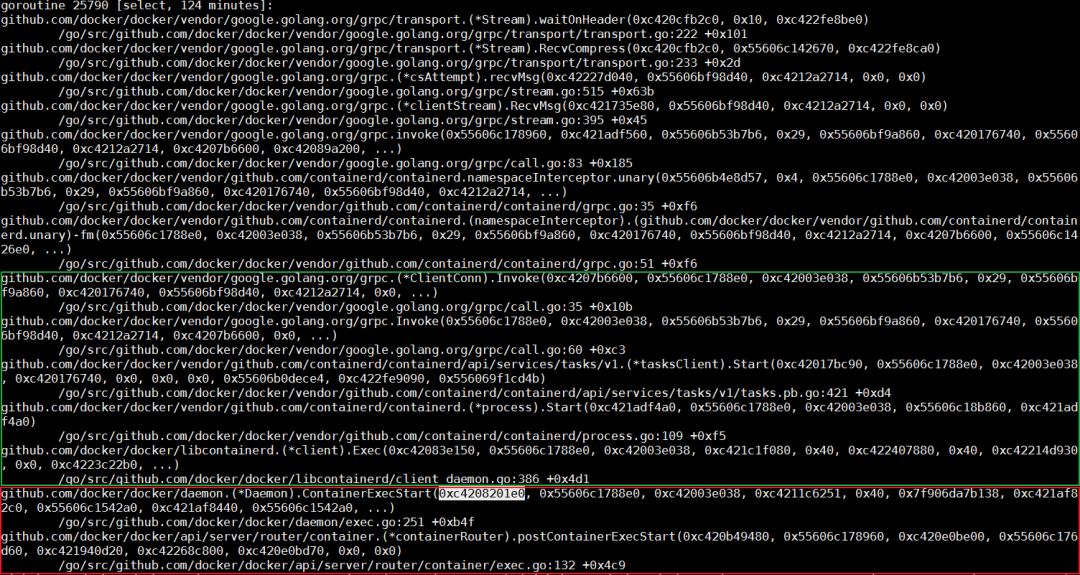 在这个问题中,既然 PLEG 认为容器 runtime 出了问题,我们需要从 docker daemon 进程看起。我们可以使用 kill -USR1 <pid> 命令发送 USR1 信号给docker daemon,而 docker daemon 收到信号之后,会把所有线程调用栈输出到 /var/run/docker 文件夹里。