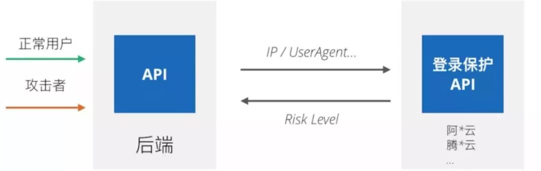 例如登录请求的来源 IP 地址,时间,手机号,User-Agent 等等数据,并且把这些数据传递给第三方 API,由他们进行一次分析判断,并把结果返回给服务器,告诉服务器当前请求者是可信用户还是可疑用户。